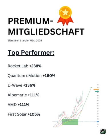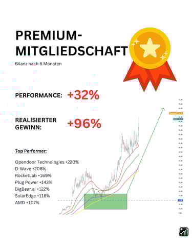 Dass dieser analytische Ansatz funktioniert, belegen die Ergebnisse: Im Jahr 2025 konnte das Premium-Portfolio den Markt (S&P 500 und Nasdaq) mit einer Performance von 49% und einem realisierten Gewinn von 116% signifikant outperformen. (Hinweis: Die vergangene Wertentwicklung ist kein zuverlässiger Indikator für zukünftige Ergebnisse.)